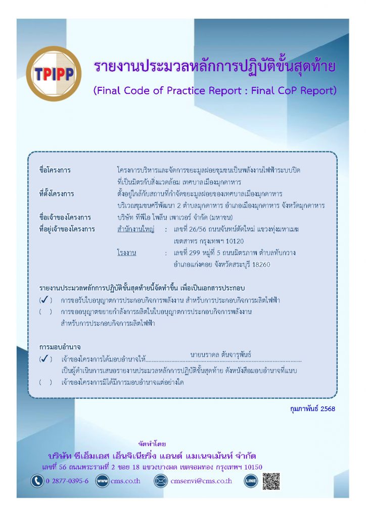 การศึกษาและการจัดทำรายงานตามประมวลหลักการปฏิบัติ โรงงานผลิตไฟฟ้าพลังงานแสงอาทิตย์ ด้วยเทคโนโลยีโฟโตโวลเทอิก แบบทุ่นลอยน้ำ ของบริษัท เอส พี เอ็ม อาหารสัตว์ จำกัด
